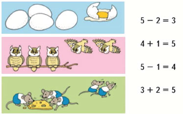 Было 5 яиц. 1 яйцо разбилось. Стало 4 яйца.