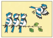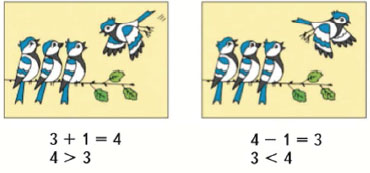 Было 3 птички. Прилетела еще 1. Стало 4 птички.