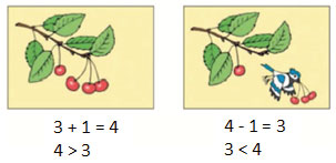 Узнаем, какими знаками в математике обознача­ют слова: больше, меньше, равно.