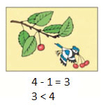 Было 4 птички. Улетела 1 птичка. Стало 3 птички.