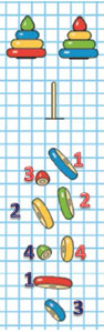 В каждой пирамидке по 4 кольца разных цветов и размеров. Обозначим каждое нужное кольцо цифрами определённого цвета.