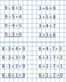 | 9 - 6 | 3 + 6 | 8 - 3 + 4 | 6 + 4 - 7 |