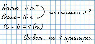 4. Катя составила 6 примеров с ответом 8, а Валя — 10 таких примеров. На сколько больше примеров составила Валя, чем Катя?