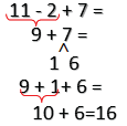 13 - 4 = 9 13 - 8 = 5 12 - 5 = 7 11 - 2 + 7 = 16