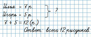 2. На выставку детских рисунков взяли 7 ри­сунков Ильи и 5 рисунков Игоря. Используя это условие, составь две зада­чи, одна из которых решается сложением, а другая — вычитанием. Реши эти задачи.