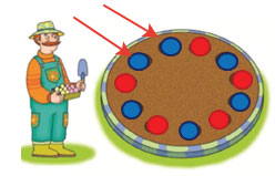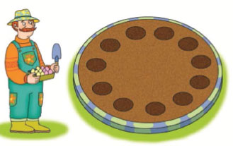 2) Нужно, чтобы количество луковиц было одинаковым, тогда и на круглой клумбе можно будет разместить цветы в соответствии с условием задачи (но не этих лунках). Лунок будет 10 или 12. Например, так: