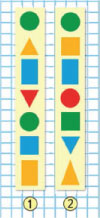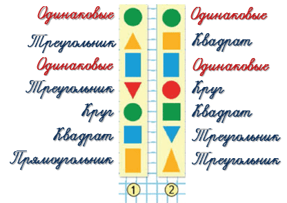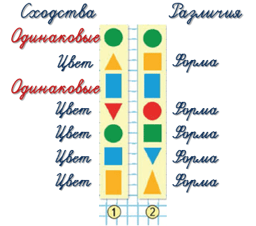 Сравни фигуры по форме и цвету.
