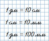1 м = дм | 3 дм = м | 4 см = мм |