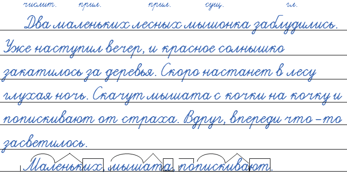 1. Два (числ.) маленьких (им. прил.) лесных (им. прил.) мышонка (им. сущ.) заблудились (глагол). 2. Уже наступил вечер, и красное солнышко закатилось за деревья. 3. В лесу скоро настанет глухая ночь. 4. Скачут мышата с кочки на кочку и попискивают от страха. 5. Вдруг что-то засветилось впереди.