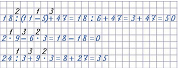 | 18 : (11 - 5) + 47 = 56 1) 11 - 5 = 6 2) 18 : 6 = 3 3) 3 + 47 = 50 | 2 • 9 - 6 • 3 = 0 1) 2 • 9 = 18 2) 6 • 3 = 18 3) 18 - 18 = 0 |