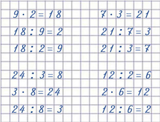 | 9 • 2 = 18 | 7 • 3 = 21 | 24 : 3 = 8 | 12 : 2 = 6 |