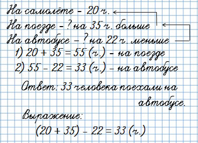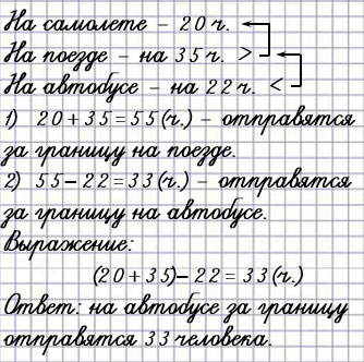 17. За границу отправляются туристы: на самолёте 20 человек, на поезде на 35 человек больше, чем на самолёте, а на автобусе на 22 человека меньше, чем на поезде.