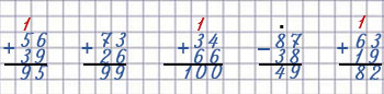 | 7 • (30 - 28) = 14 | 70 : 7 • 9 = 90 |