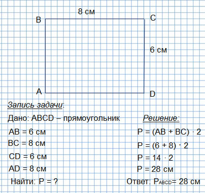 1) У прямоугольника противолежащие стороны равны. Поэтому сумму всех сторон прямоугольника можно заменить умножением суммы соседних сторон на 2.