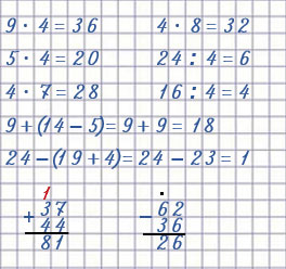 | 9 • 4 = 36 | 4 • 7 = 28 | 24 : 4 = 6 |