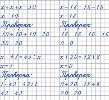 | х • 43 = 43 : х х = 1 | х + 20 = 12 + 8 х = 0 |