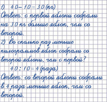 1. С первой яблони собрали 40 кг яблок, а со второй только 10 кг. На сколько больше килограммов яблок собрали с первой яблони, чем со второй? Во сколько раз меньше ... ?