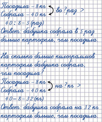 2. Бабушка посадила весной 8 кг картофеля, а осенью собрала 40 кг. Во сколько раз больше она собрала картофеля, чем посадила?
