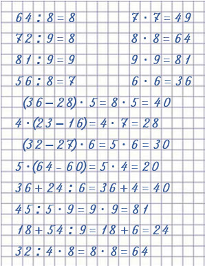 | 4 • (23 - 16) = 28 | 45 : 5 • 9 = 81 |