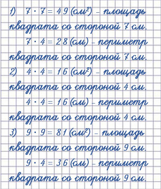 5. Найди площадь и периметр квадрата, если длина его стороны 7 см; если длина его стороны 4 см; если длина его стороны 9 см.