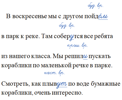 В воскресенье мы с другом пойд... в парк к реке. Там собер..тся все ребята из нашего класса. Мы решил.. пускать кораблики по маленькой речке в парке. Смотреть, как плыв... по воде бумажные кораблики, очень интересно.