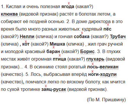 1. Кислая и очень полезная ягода клюква растёт в болотах летом, а собирают её поздней осенью. 2. В доме директора в это время было много разных животных: кудрявый пёс Нелли и гончая собака Трубач, кот Мишка, жил грач ручной и молодой красивый баран Борис. 3. В глухих местах живёт огромная птица глухарь... 4. В осиннике стоял рогатый лось-великан. 5. Лось, выбрасывая вперёд ноги-ходули, помчался легко по вязкому болоту, как мчится по сухой тропинке заяц-русак.