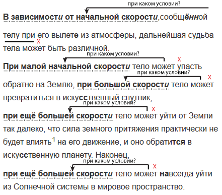 В зависи мост.. от начальной скорост.. сообщ..(н, нн)ой телу при его вылет.. из атмосферы дальнейшая судьба тела может быть различной. При малой начальной скорост.. тело может упасть обратно на Землю при большой скорост.. тело может превратиться в иску(с, сс)твенный спутник при ещё большей скорост.. тело может уйти от Земли так далеко что сила земного притяжения практически не будет влиять1 на его движение и оно обратит(?)ся в иску(с, сс)твенную планету. Наконец, при ещё большей скорост.. тело может (на)всегда уйти из Солнечной системы в мировое пространство.