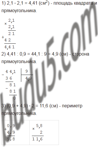 Площадь прямоугольника равна площади квадрата со стороной 2,1 см. Одна из сторон прямоугольника равна 0,9 см. Вычислите периметр прямоугольника.