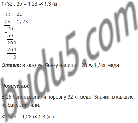 В 25 банок разлили поровну 32 кг меда. Сколько меда налили в каждую банку? Ответ округлите до десятых.