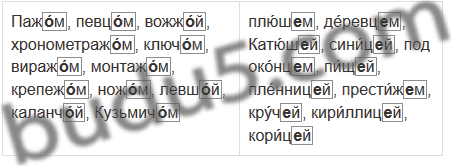 Паж..м, певц..м, вожж..й, плюш..м, деревц..м, хронометраж..м, Катюш..й, ключ..м, синиц..й, под