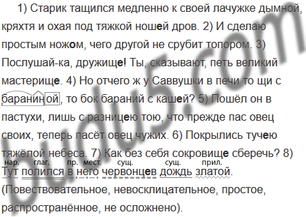 1) Старик тащился медленно к своей лачужке дымной, кряхтя и охая под тяжкой нош..й3 дров. 2) И сделаю простым нож..м, чего другой не срубит топором. 3) Послушай-ка, дружищ..! Ты, сказывают, петь великий мастерищ.. . 4) Но отчего ж у Саввушки в печи то щи с бараниной2, то бок бараний с каш..й? 5) Пошёл он в пастухи, лишь с разниц..ю тою, что прежде пас овец своих, теперь пасёт овец чужих. 6) Покрылись туч..ю тяжёлой1 небеса. 7) Как без себя сокровищ., сберечь? 8) Тут полился в него червонц..в дождь златой.4