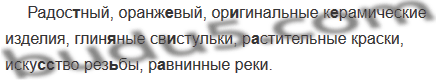 Радос(?)ный, оранж..вый, ор..гинальные к..рамичес кие изделия, глин..ные св..стульки, р..стительные крас ки, иску(с, сс)тво рез(?)бы, р..внинные реки.