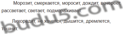 Морозит, смеркается, лихорадит, моросит, не хочется, дождит, дышится, дремлется, вечереет, рассветает, тошнит, светает, подмораживает.