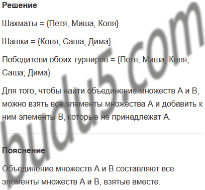 Задание № 2. В классе проводился шахматно-шашечный турнир. А - множество победителей шахматного турника, а В - шашечного турнира. Назови элементы множеств А и В. Чему равно их объединение?