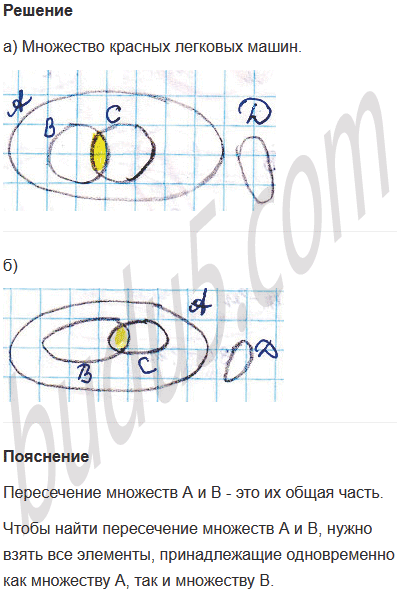 а) Пусть А - множество машин, В - множество легковых машин, С - множество машин красного цвета, D - множество гаражей. Найди на диаграмме, где какое множество расположено. Что означает раскрашенное множество?