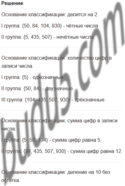 Задание № 4. Разбей на части множество чисел А = {5, 50, 84, 104, 435, 507, 930}. Найди несколько решений. Для каждого решения укажи основание классификации, полученные группы и их название.
