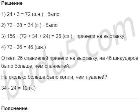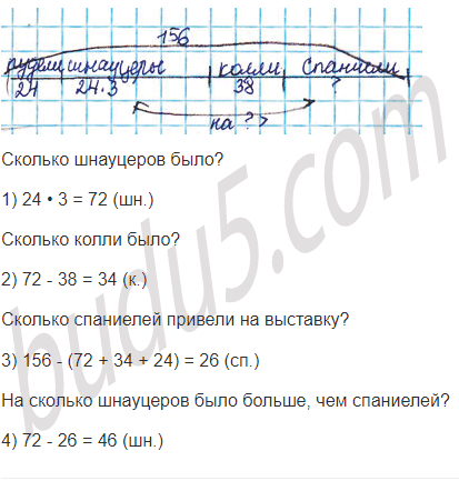 Задание № 10. На выставку привели 156 собак четырёх пород: пуделей, шнауцеров, колли и спаниелей. Пуделей было 24, шнауцеров - в 3 раза больше, чем пуделей, а колли - на 38 меньше, чем шнауцеров. Сколько спаниелей привели на выставку? На сколько шнауцеров было больше, чем спаниелей?