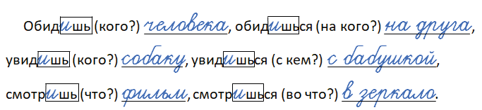 Обид_шь (кого?) ___, обид_шься (на кого?) ___, увид_шь (кого?) ___, увид_шься (с кем?) ___, смотр_шь (что?) ___, смотр_шься (во что?) ___.