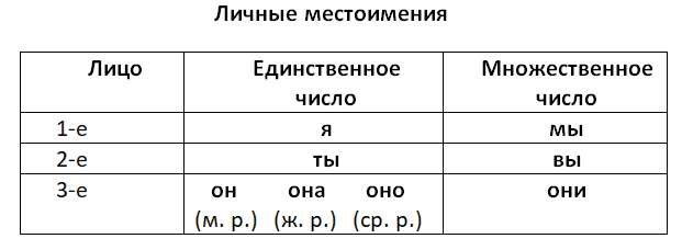 Личные местоимения бывают первого, второго и третьего лица. Они изменяются по числам. В 3-м лице единственного числа местоимения изменяются по родам.