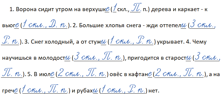 1. Ворона сидит утром на верхушк_ ( _ скл., _ п.) дерева и каркает - к вьюг_ ( ___ ). 2. Большие хлопья снега - жди оттепел_ ( ___ ). 3. Снег холодный, а от стуж_ ( ___ ) укрывает. 4. Чему научишься в молодост_ ( ___ ), пригодится в старост_ ( ___ ). 5. В июл_ ( __ ) овёс в кафтан_ ( ___ ), а на греч_ ( ___ ) и рубах_ ( ___ ) нет.