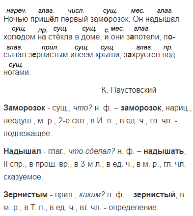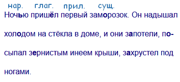 Ноч..ю приш..л первый зам..розок3. Он надышал3 хол..дом на стёкла в доме, и они з..потели, п..сыпал з..рнистым3 инеем крыши, з..хрустел под ногами.