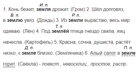 1. Конь бежит, земля дрожит. 2. Шёл долговяз, в землю увяз. 3. Из земли вырастаю, весь мир одеваю. 4. Под землёй птица гнездо свила, яиц нанесла. 5. Красна, сочна, душиста, растёт низко, к земле близко. 6. Алый сапог в земле горит.4